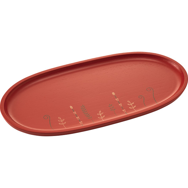 ■天然木をくり抜いて小判盆を作りました。このやわらかい表情の小判盆のフォルムは木地加工の中でも複雑で困難な仕事のひとつです。その盆をふんわりとした朱で塗りあげ、柔らかな表情の春の小さな草花を手描きしました。蒔絵職人の技術とセンスが必要です。かかわったすべての職人の手技が合わさってこの美しい小判盆が具体化しました。