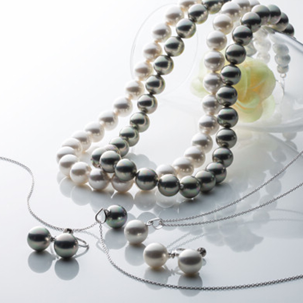 ■貝パールの中でも特に輝きの美しい珠を使ったネックレス、イヤリング、ペンダントの3点セット。すべての珠と珠の間にシリコンを挿入し、ワイヤーで組み上げた仕上げています。直径10ミリの大きな珠なのでとてもボリュームがあります。