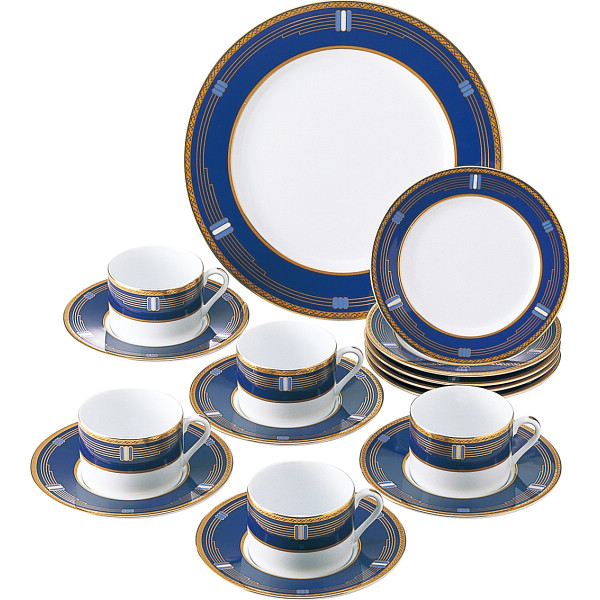 パーティーの後のコーヒータイムにも活躍しそうなセット シックなブルーで落ち着いた雰囲気、金の縁取りで豪華さもだしています。