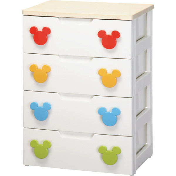 キャラクター(ミッキー)が付いた木天板付きチェストです。おむつや衣類など子供の成長に合わせて使用できます。引出しには開閉がスムーズなスライドレールを採用しています。取っ手はかわいらしいデザインで、子供でも握りやすい大きさです。