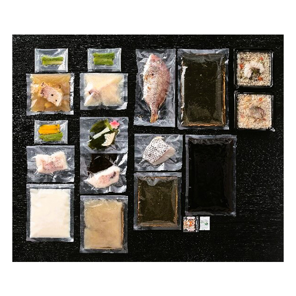 内容:甘鯛炊き込みごはん・甘鯛のリゾット各180g、甘鯛酒蒸し野菜あんかけ(甘鯛35g(昆布付)、あんかけ出汁150g、湯通し筍・梅麩・みつば)、甘鯛とかぼちゃのクリームスープ(甘鯛35g、クリームスープ100g、ボイル南瓜・アスパラ)、甘鯛とアスパラのワインソース(レモン風味)焼き(甘鯛とワインソース60g、ボイルアスパラ)、甘鯛のアクアパッツア(甘鯛とアクアパッツアソース180g、ボイルアスパラ)、鳴門鯛 鯛めし(焼き鯛100g、出汁360g)、鳴門鯛 鯛めし漁師風(鯛50g、出汁360g、〆の茶漬け出汁180g、山椒・ごま)
