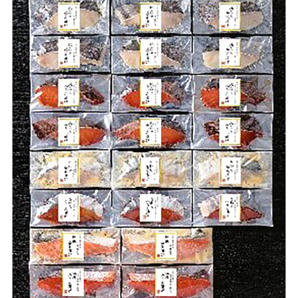 内容:銀ダラ西京漬70g×6、銀ダラ味醂漬70g×6、紅鮭西京漬70g×2、紅鮭味醂漬70g×2、サワラ西京漬70g×3、サワラ味醂漬70g×3