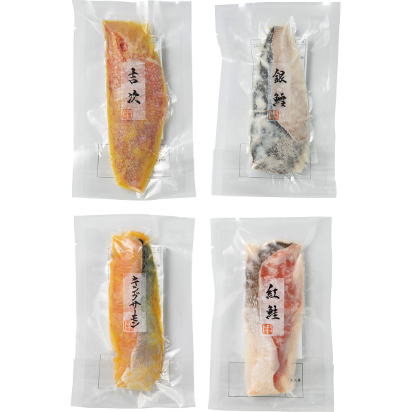 内容:アラスカ吉次西京漬け100g×6、キングサーモン西京漬け・銀鱈粕漬け・紅鮭粕漬け各80g×各6