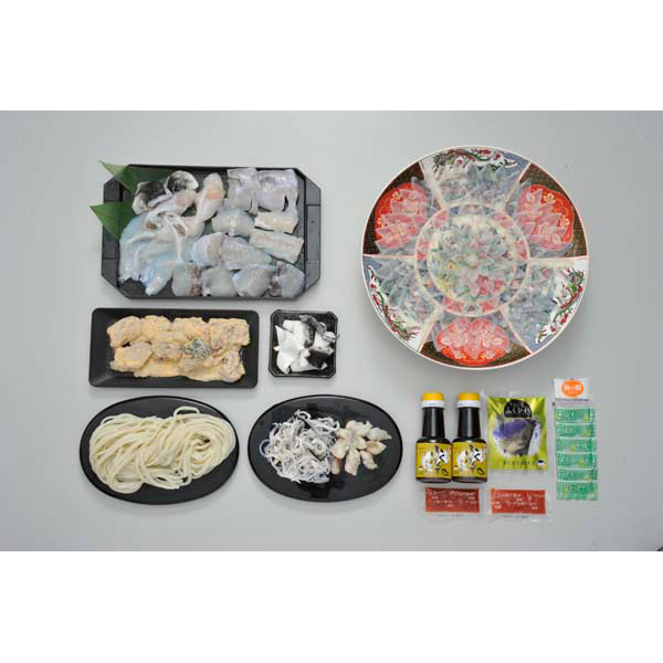内容:とらふく刺身150g(陶器絵皿33cm)、とらふく皮120g、とらふくちり身・アラ500g、とらふぐコラーゲンしゃぶ用皮50g、とらふくから揚げ粉付き230g、とらふく入りうどん250g、ひれ酒用ヒレ5枚、ポン酢150ml×2、モミジオロシ16g×2、塩5g、カボス果汁2ml×6 ※刺身皿の柄は変わる場合がございます。
