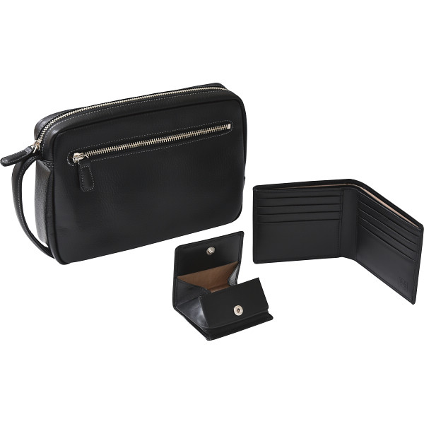 日本の職人さんが一つ一つ丹念に作ったセカンドバック、カードがたくさん入る二つ折れの財布と小銭入れの3点セットです。