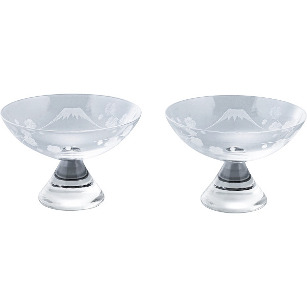 日本酒の酒器として定番の盃をステムグラスに仕上げました。飲み口が薄く、素直に味を楽しむことができます。また、人気の江戸切子で富士と桜の模様を施しました。お酒を注ぐとゆらめく日本の風景を愉しめます。