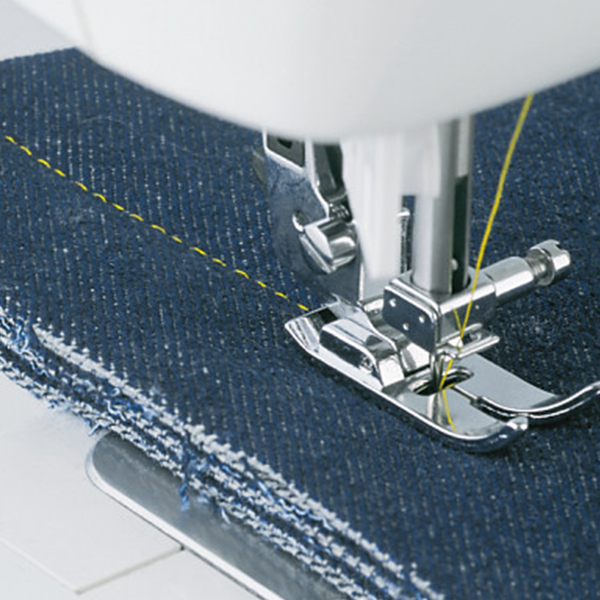 自動糸調子で縫い目が綺麗、両手が使えて便利な足踏みコントローラー式、LEDライト搭載、ロックカッターをつければ布端を切りながら縁かがり可能です