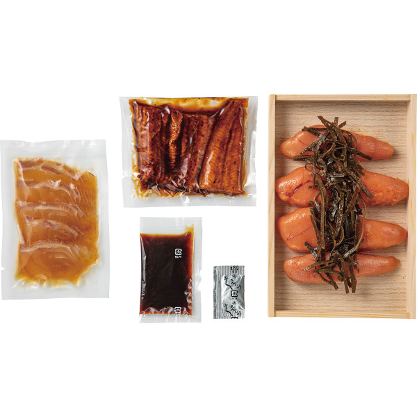 内容:うなぎ蒲焼(うなぎ:国産使用)60g・たれ20ml・山椒0.2g・鯛漬け60g×各5、柚子風味辛子明太子(すけとうだらの卵巣:ロシアまたはアメリカ産使用)235g×2