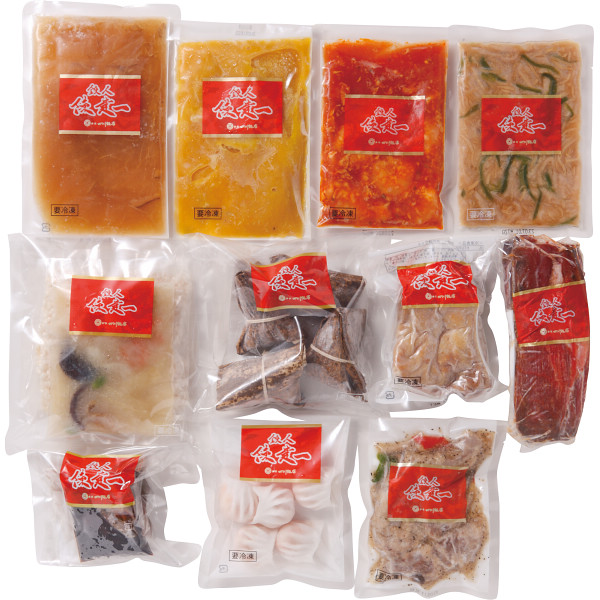 内容:(フカヒレ姿蟹味噌煮180g・ローストビーフ190g・つるし焼豚430g・牛サーロインの黒胡椒炒め180g・大海老チリソース180g・フカヒレスープ250g・角煮入りちまき4個入240g・油淋鶏セット150g・海鮮おこげセット210g・えび餃子5個入100g・青椒肉絲150g)×各1