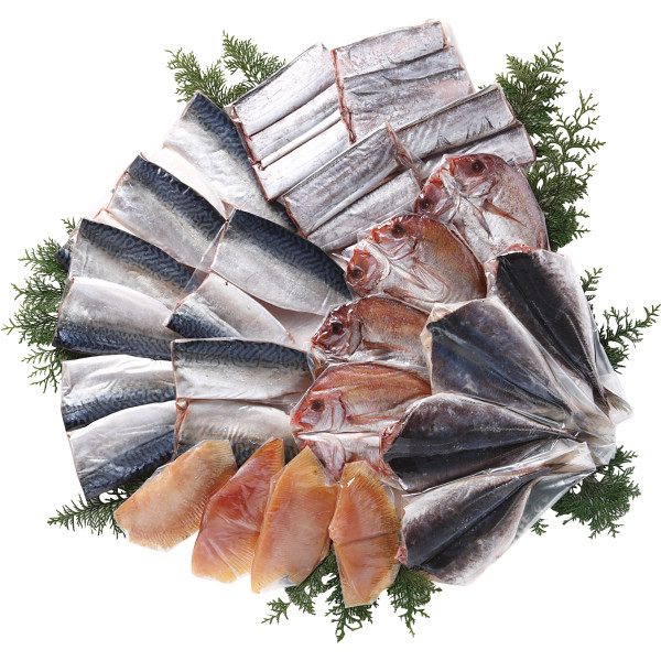 内容:ソフト干物(サバ300g×6・(アジ150g・タイ150g・タチウオ200g・エイヒレ100g)×各4)