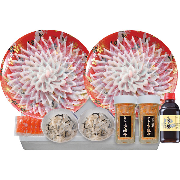 内容:とらふぐ刺身120g×2、とらふぐ皮30g×2、とらふぐ塩辛60g、とらふぐ塩辛(ゆず胡椒風味)60g、ふくポン酢180ml、もみじおろし10g×4