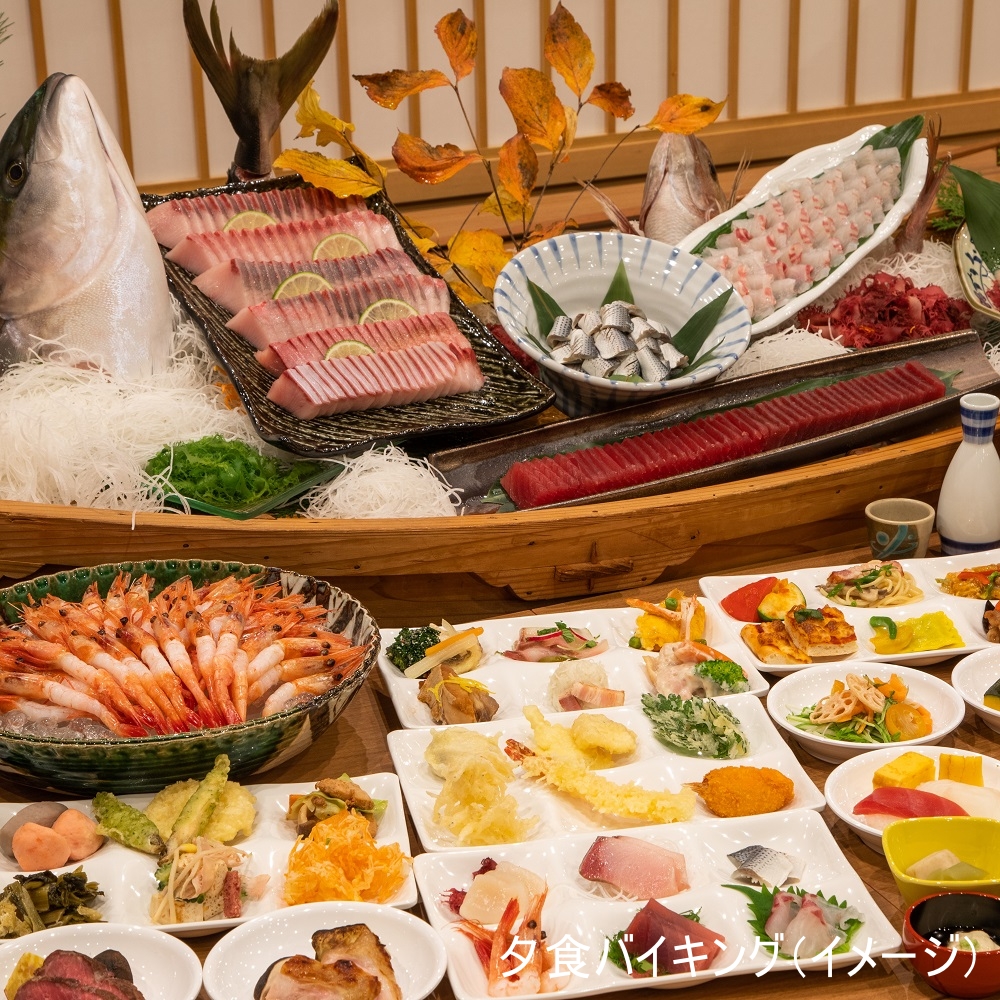 四季折々の趣豊かな景観が楽しめる大露天風呂をはじめ、高天井の合掌風呂、岩風呂などバラエティに富んだ湯浴みをお楽しみいただけます。旬の食材や地場の料理でお迎えするバイキングも好評です。