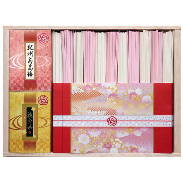 讃岐うどんと南高梅うどんにおめでたい席に合う純金茶、紀州産の南高梅を詰め合せた贈り物です。