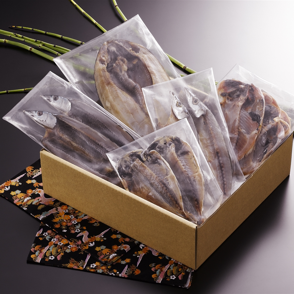 内容:真あじ開き2枚(計120g)、かます開き2枚(計160g)、さんま開き2枚(計180g)、金目鯛開き2枚(計180g)、ほっけ開き1枚(200g)