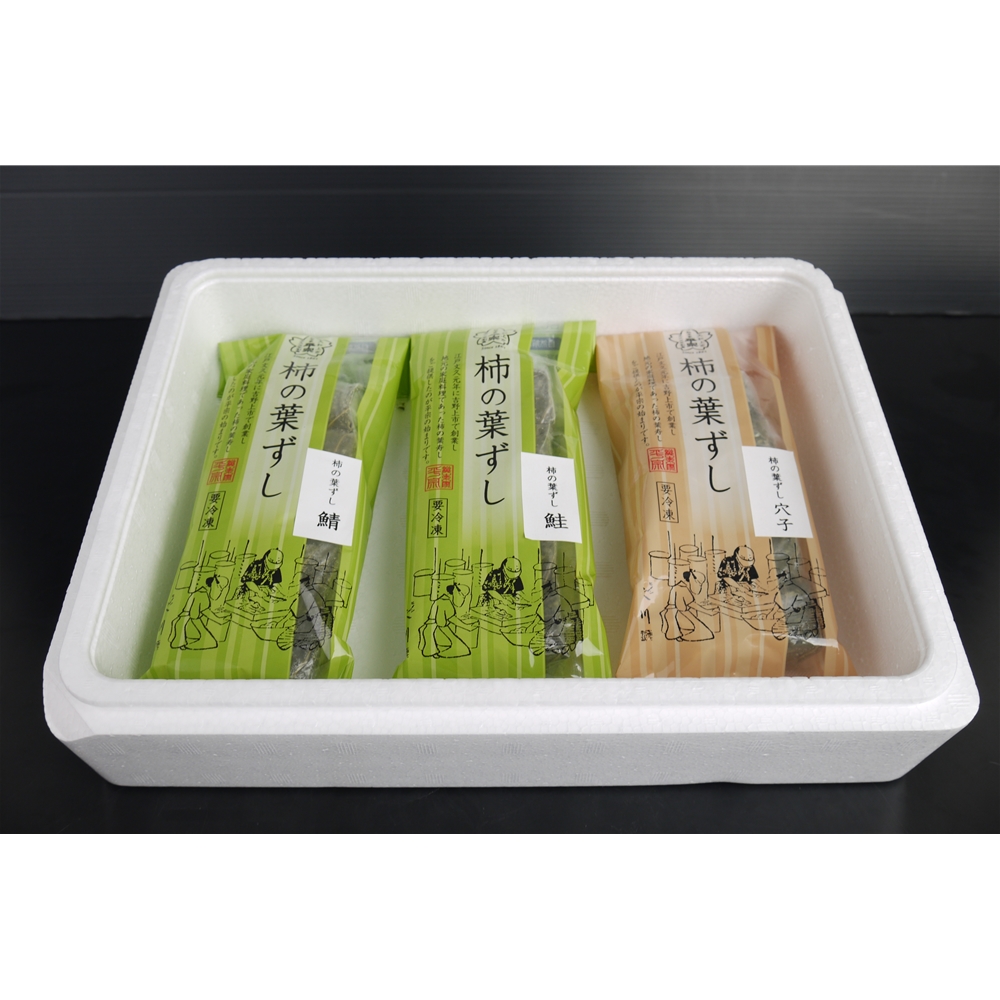 内容:柿の葉ずし鯖5個入195g×1、柿の葉ずし鮭5個入195g×1、柿の葉ずし穴子5個入195g×1