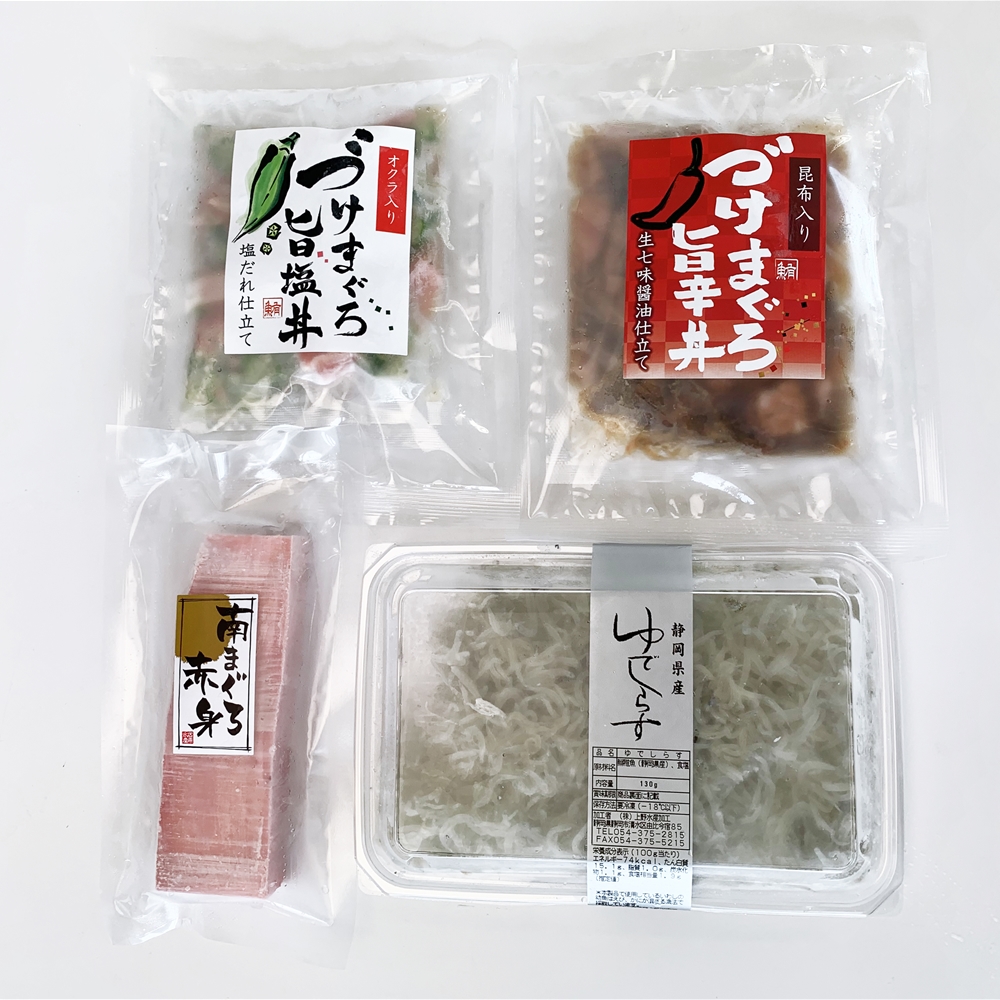 内容:南まぐろ赤身150g、漬けまぐろ旨塩丼の具160g(80g×2)、漬けまぐろ旨辛丼の具140g(70g×2)、ゆでしらす130g