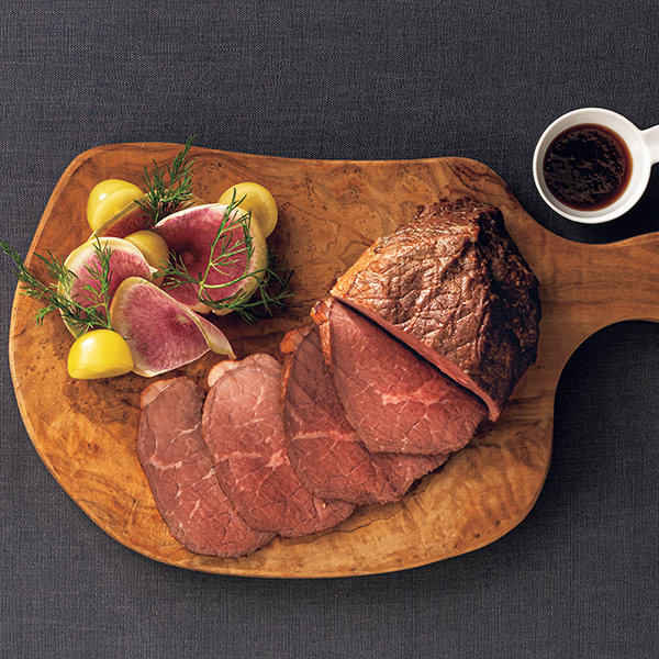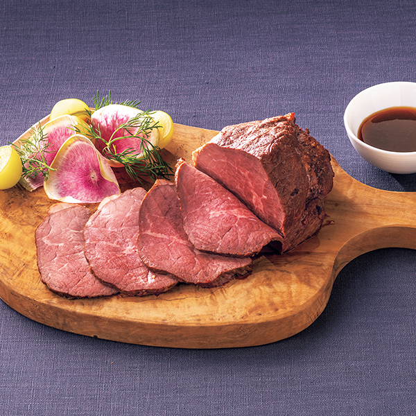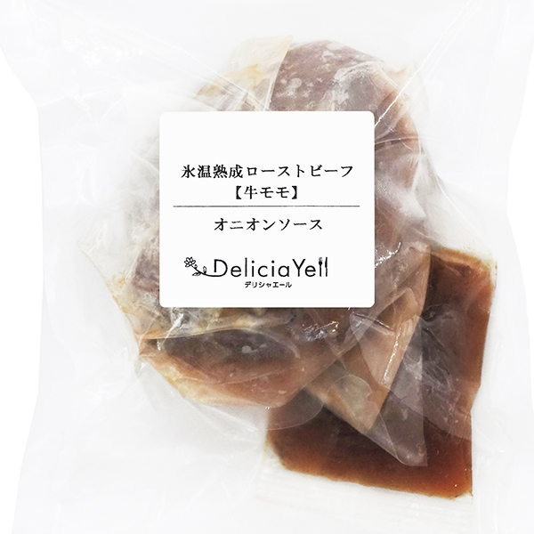 氷温で熟成させ、素材のおいしさを引き出したもも肉を使用したローストビーフです。赤身で牛肉本来の味が濃いのが特長です。玉ねぎの旨みとフルーツや蜂蜜の程よい甘みがローストビーフにピッタリな、醤油ベースのオニオンソースでお召しあがりください。