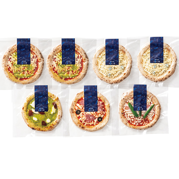 内容:マルゲリータ・クワトロフォルマッジ×各2枚、ジェノベーゼ・ミラノサラミ・本格ベーコンとアスパラガス×各1枚(すべて直径約15cm)