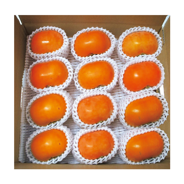 次郎柿は、四角く側面にくぼみがある形が特長。果肉は果汁が少なく固めで、サクサクとした食感が楽しめます。『富有はあごで食べ、次郎は歯で食べる』と言われるように、その歯ごたえこそが、次郎柿の醍醐味。種がほとんどなく食べやすいことも魅力です。