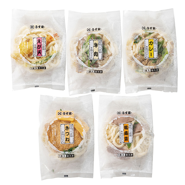 内容:えび天手延うどん580g、牛肉手延べうどん・カレー手延うどん・きつね手延べうどん 各540g、鴨南蛮手延べうどん520g