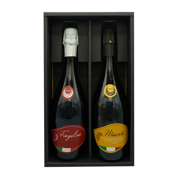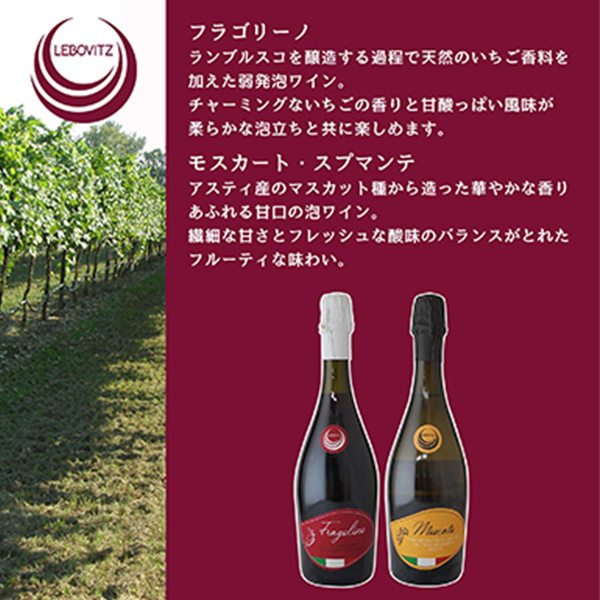 これからワインデビューされる方やパーティに最適!甘口スパーク紅白セット!ランブルスコの実力生産者、「レボヴィッツ」が手掛ける、天然いちご香料を加えた微発泡ワインとマスカット種から造られた甘口スパークリングワインのセット。