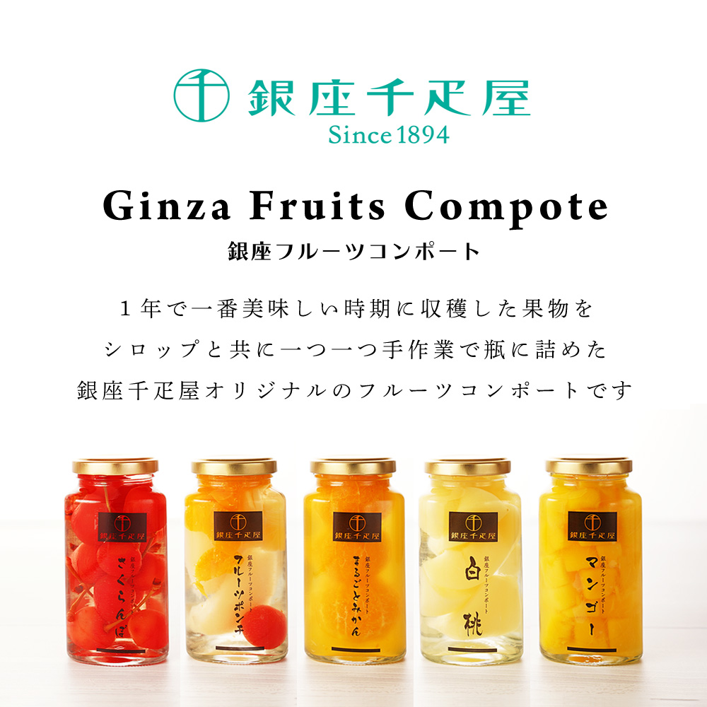 一年で一番美味しい時期に収穫した果物を、甘さ控えめのシロップと一緒に、ひとつひとつ手作業で瓶に詰めました、銀座千疋屋オリジナルのフルーツコンポートです。《みかん》和歌山県産のみかんを余すところなく味わっていただける、まるごと果実の入ったコンポートです。《さくらんぼ》日本一の生産地、山形県で収穫されたさくらんぼをコンポートに仕上げました。《マンゴー》完熟したマンゴーをパッションフルーツ果汁を加えたシロップでコンポートに仕上げた爽やかなコンポートです。《白桃》最も美味しい時期に収穫された白桃を風味豊かなシロップで仕上げたコンポートです。