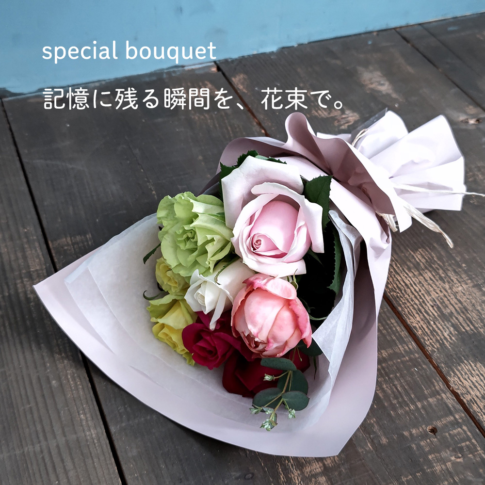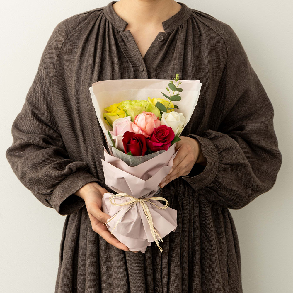 ピンク、レッド、イエロー、ホワイト、オレンジ…色とりどりのバラの中よりギフトに最適なバラを選定し、組み合わせたおまかせバラのブーケです。まるでドレスをまとったようなふわりと重ねたフリルがかわいいラッピングでお届けします。また、一緒にセットしたスイーツは、真ん中から動物たちがひょっこり顔を出した、食べるのがもったいなくなる焼きドーナツです。