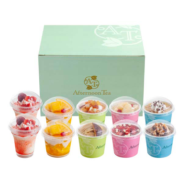 内容:苺のパフェ80ml・スイートフルーツティーパフェ82ml×各2、渋皮栗のモンブラン94ml×1、洋梨とアールグレイ・苺とチーズ・スイートポテト・チョコバナナ・ダブルチョコレート各103ml×各1(計10)