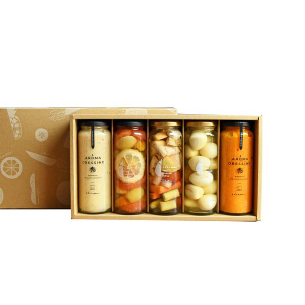 内容:水なすピクルス和風MIX(細瓶)200g、うずら卵のピクルス(細瓶)220g、6種コンポート210g、アロマドレッシング(オレンジ&ジンジャー&にんじん)200ml、アロマドレッシング(ゆず&山椒&白みそ)200ml×各1本