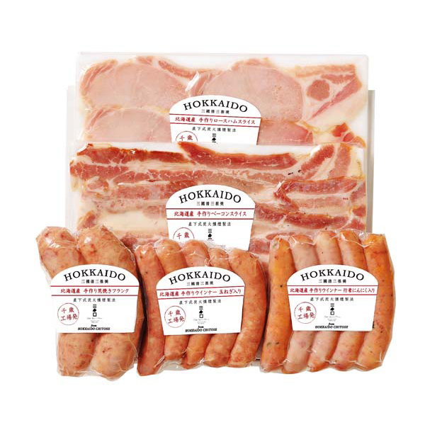 内容:三國推奨北海道産手作りウインナー(玉ねぎ入り、行者にんにく入り)×各110g、三國推奨北海道産手作りベーコンスライス×70g、三國推奨北海道産手作りロースハムスライス×80g、三國推奨北海道産手作り荒挽きフランク×150g