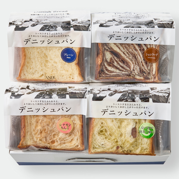 京都のデニッシュ食パン専門店ANDE(アンデ)から、デニッシュ食パンを詰合せてお届けします。定番のプレーンとチョコに、りんごとシナモンの相性が良いシナモンりんご、抹茶の香りとあずきのほのかな甘みが魅力の抹茶大納言のセット。まずはそのまま本来の味をどうぞ。トースターでほんのり焦げ目がつく程度焼くと、香ばしい香りと、表面はサクサク中はふわっとした食感がお楽しみいただけます。