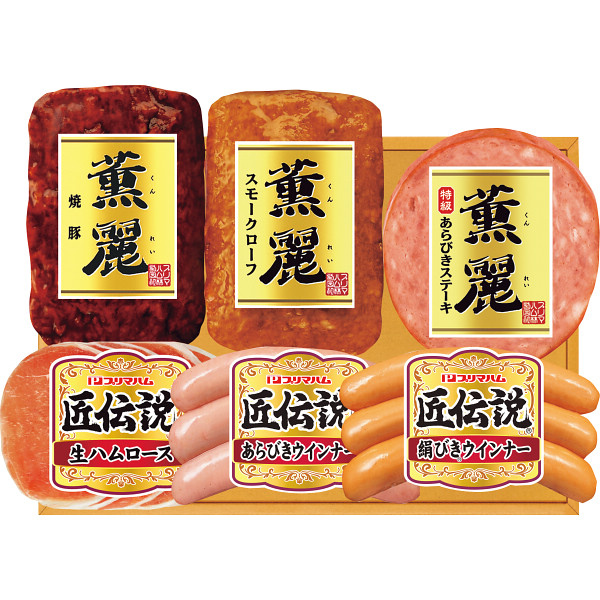 内容:スモークローフ140g、焼豚120g、特級あらびきステーキ50g、生ハムロース32g、あらびきウインナー60g、絹びきウインナー60g