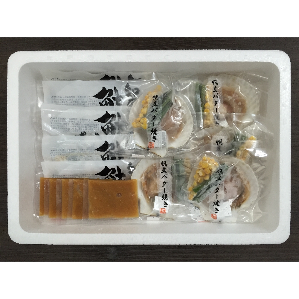 ちゃんちゃん焼きは鮭などの魚と野菜を鉄板で焼く料理で、北海道で漁師町の名物料理です。2007年に農林水産省の主催で選定された農山漁村の郷土料理百選でジンギスカン、石狩鍋と共に北海道を代表する郷土料理として選出されております。本来、外で大きな鉄板の上で大胆に焼き上げる料理ですが、いつでもご家庭で手軽に召し上がれる様、ひと手間加えた鮭の切身を特製の味噌たれに漬け込み一枚一枚を小分け真空いたしました。北海道に古くからある浜の漁師料理をご堪能ください。帆立バター焼きは、北海道産の帆立貝とグリーンアスパラガス・トウモロコシ・仕上げのバターもセットしました。食べやすいように片方の貝殻とウロを取り除き、帆立貝を手軽にお楽しみ頂けるように致しました。磯の香りとバター醤油の香ばしい風味、プリプリの食感をお楽しみください。