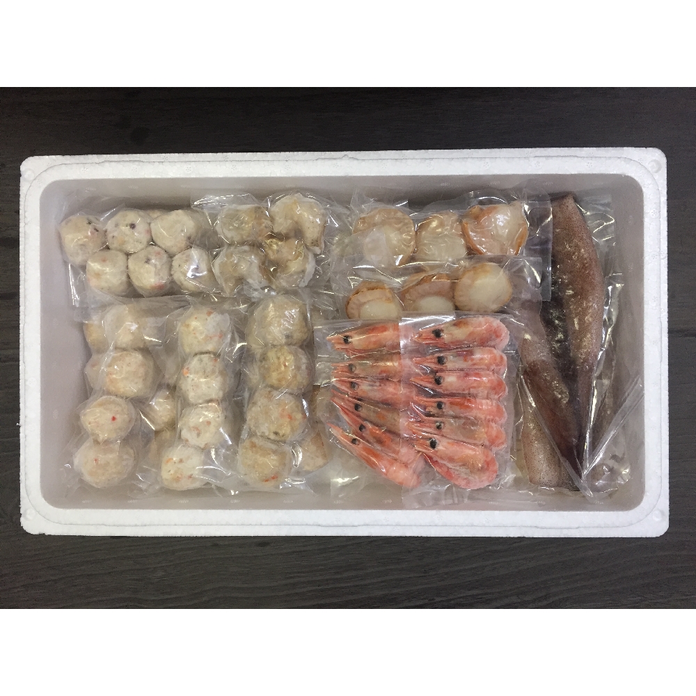 内容:かに入つみれ×12個、えび入つみれ×12個、とりごぼうつみれ×12個、たこ入つみれ×12個、ボイル海老×12尾、ボイル帆立×6個、ボイルつぶ60g×3袋、ツボ抜きいか100g×3尾、冷凍うどん250g×1玉、たれ(濃縮:醤油仕立て)50ml×4袋※3~4人前