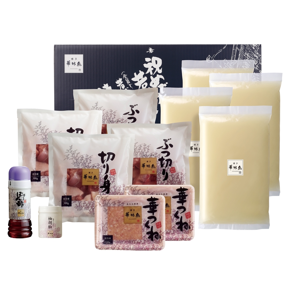 内容:水たき生スープ600g×4、切り身300g×2、ぶつ切300g×2、華つくね200g×2、博多ぽん酢220ml、柚胡椒30g