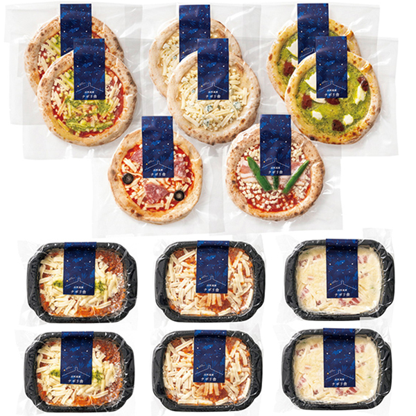 内容:ナポリピッツァ直径約15cm×8枚(マルゲリータ・クワトロフォルマッジ・ジェノベーゼ 各2枚、本格ベーコンとアスパラガス・ミラノサラミ 各1枚)、ラザニアボロネーゼ・豆乳とベーコンのグラタン 各210g×2個、伊達鶏のボロネーゼドリア240g×2個