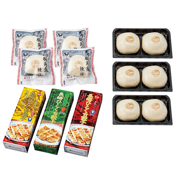 内容:長崎ひとくち餃子・長崎ひとくち餃子(蓮根入)・長崎ひとくち餃子(柚子胡椒入)各540g(54個入)、豚まん×6個、角煮まんじゅう×4個