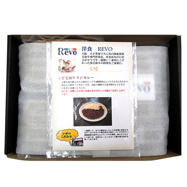 大阪を中心に洋食店・精肉店を構え、黒毛和牛を一頭買いする洋食屋『REVO』の和牛スジカレーは、上質の和牛スジのみをじっくり煮込んだコクと絶妙なスパイシー感が特長のこだわりカレーです。湯せんで温めてお召しあがりください。