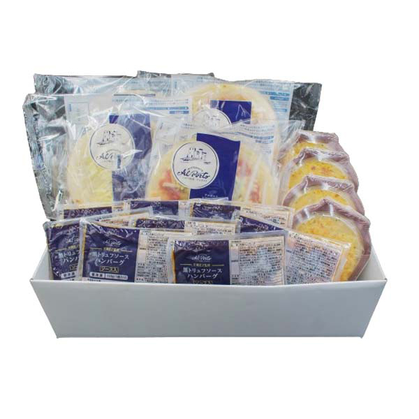 内容:黒トリュフソースハンバーグ150g×8、ポテトグラタン200g×4、(マルゲリータピッツァ210g、黒トリュフと5種チーズのピッツァ185g)×各2