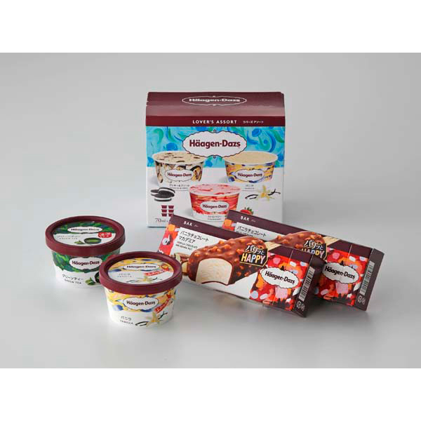内容:ハーゲンダッツラバーズアソート(バニラ、ストロベリー、クッキー&クリーム各70ml)×各2、ミニカップ(バニラ、グリーンティー各110ml)×各1、クランチーバー(バニラチョコレートマカデミア80ml)×2