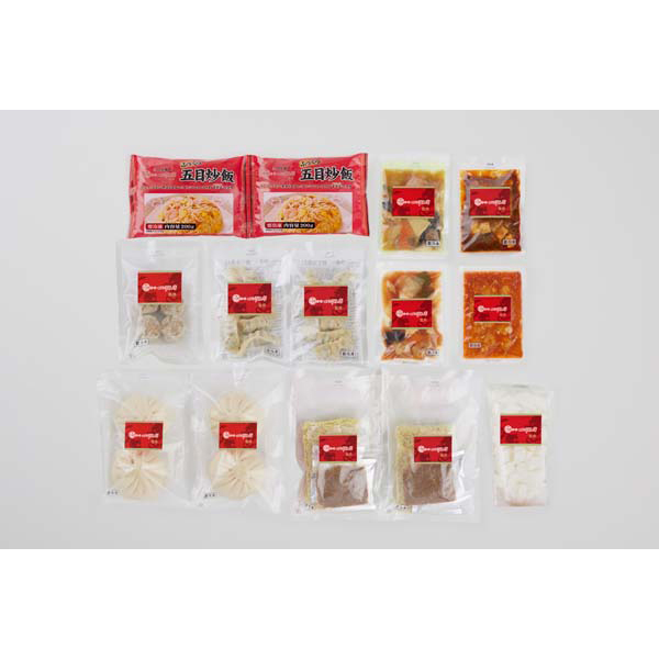 内容:乾焼蝦仁(エビチリソース)150g、四川麻婆豆腐150g、ふっくら五目炒飯(200g×2)、酢豚150g、杏仁豆腐500g、本格八宝菜150g、小籠包140g(4個入)×各1、餃子120g(6個入)、手包み肉まん240g(2個入)、担々麺セット326g(麺200g、ごまだれ38g、液体スープ58g、ザージャン(肉みそ)30g入)×各2