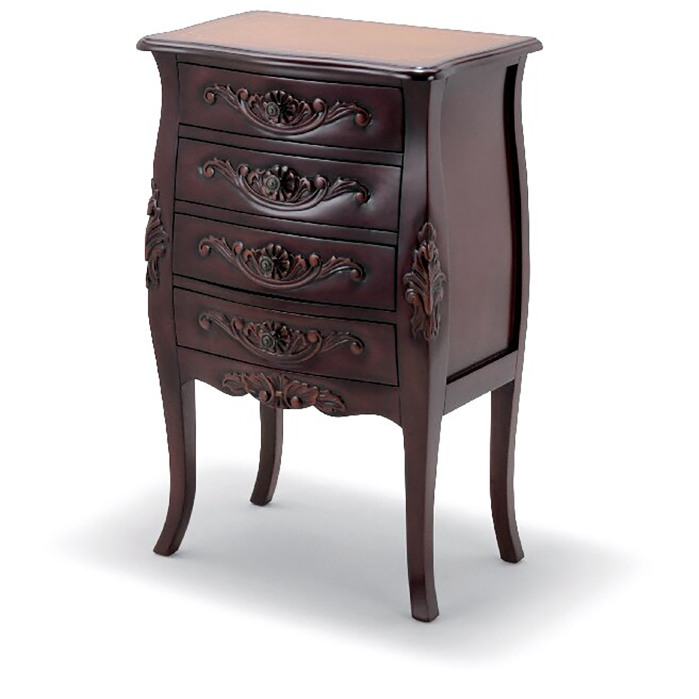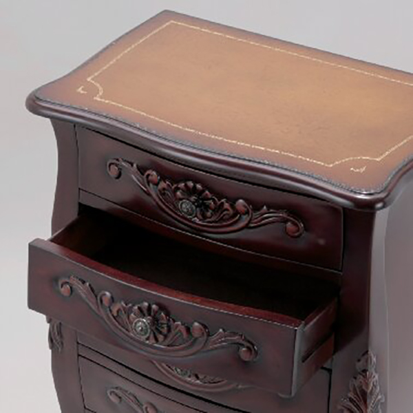 天板耐荷重約30Kg。天板はレザー調の特殊な仕上げ。手彫り仕上げ、引出し内部の底はフェルト貼りなど、細部にまで工夫を凝らしております。