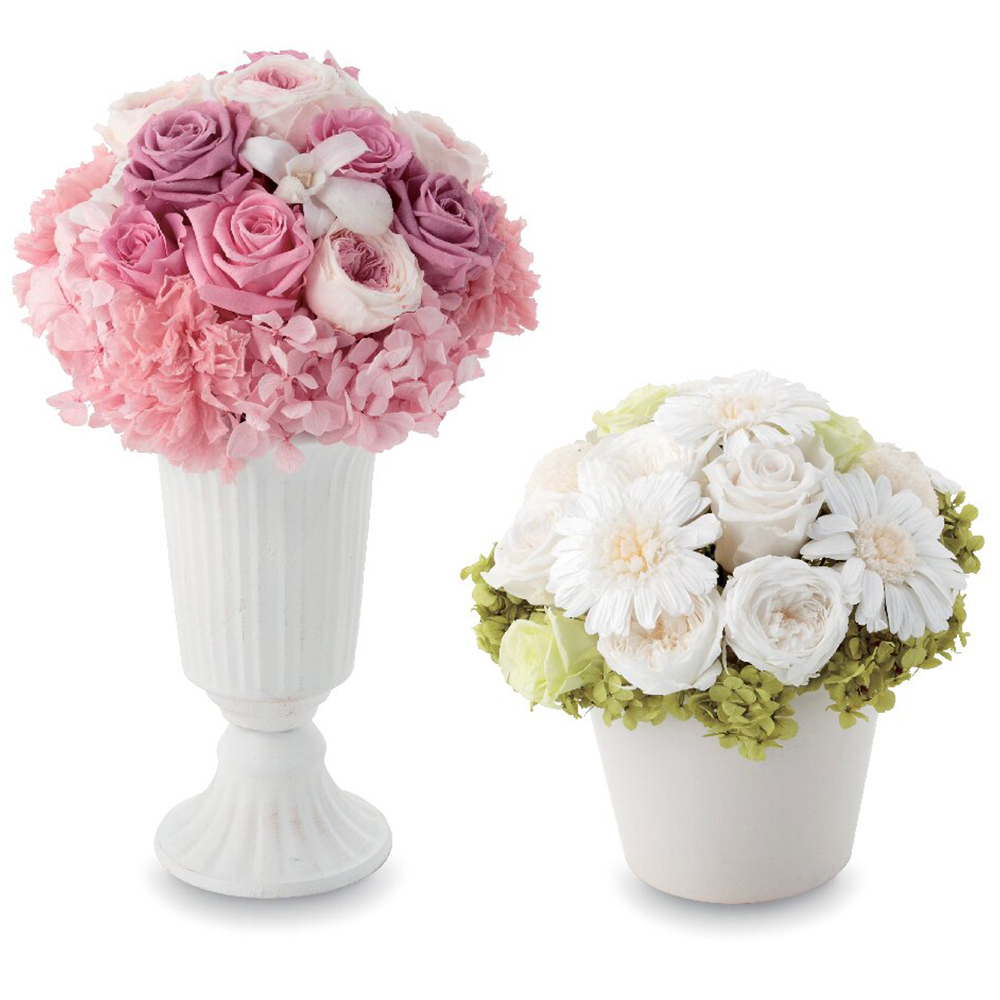 プリザーブドフラワーは、生花を加工している為、大きさ・色・形が異なる場合があります。また、花の種類、花器のデザインが変わる場合があります。