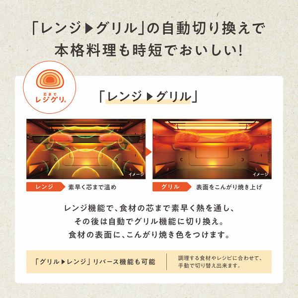●「レンジ→グリル」機能を自動で切りかえ!時短で本格料理ができる「芯までレジグリ」メニュー●新発想!食材を庫内で浮かせて調理するので、温めムラが少ない「全方位あたためうきレジ」メニュー●買ってきたコロッケや天ぷらなども揚げたてのようにサクッとおいしく仕上げる!「揚げ物サクレジ」メニュー●大皿の出入れもスムーズな「間口約40.5㎝」●見やすく使いやすい「白黒反転液晶」●操作のしやすい「ダブルダイヤル式」●奥行45㎝のカップボードにキッチリ収まる「コンパクト設計」●インテリアに馴染む、落ち着いた質感の「マット調デザイン」●STAN.限定!離乳食用ゆで野菜メニュー搭載。