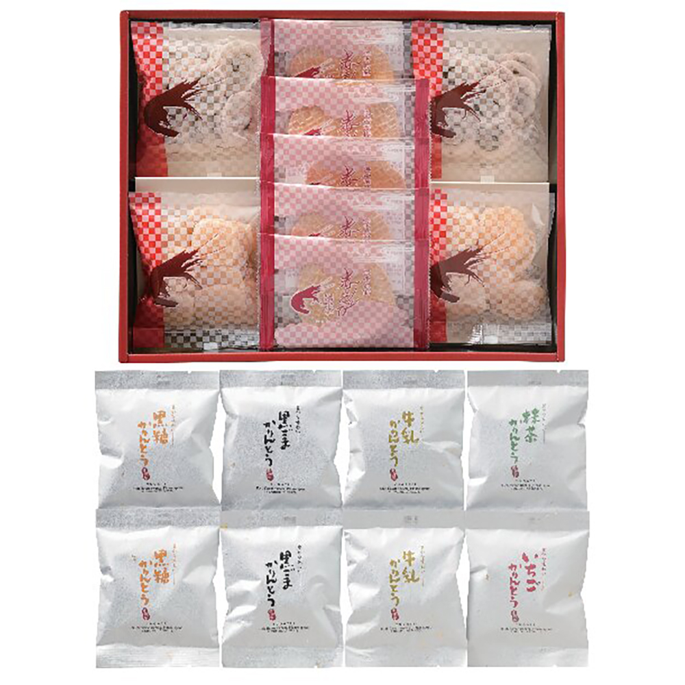 内容:赤えびせんべい×5、えびせん(うず巻き・えび松風)各10g×2、黒糖かりんとう・黒胡麻かりんとう・牛乳かりんとう各10g×2、抹茶かりんとう・いちごかりんとう各10g