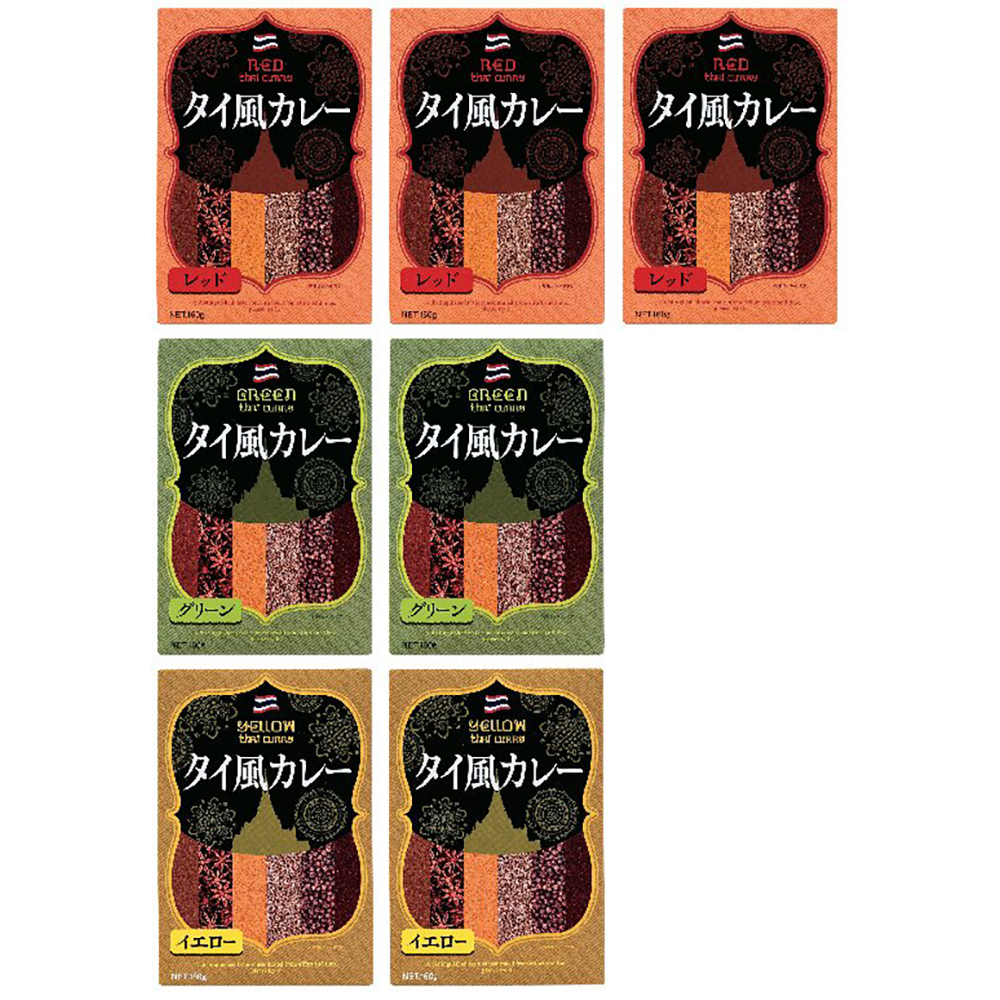 内容:タイ風レッドカレー160g×3、タイ風グリーンカレー・タイ風イエローカレー各160g×2