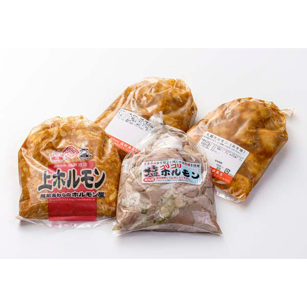内容:牛丸腸ホルモン(みそ味)・牛ホルモン(みそ味)・上ホルモン(みそ味)・コリコリ塩ホルモン×各300g