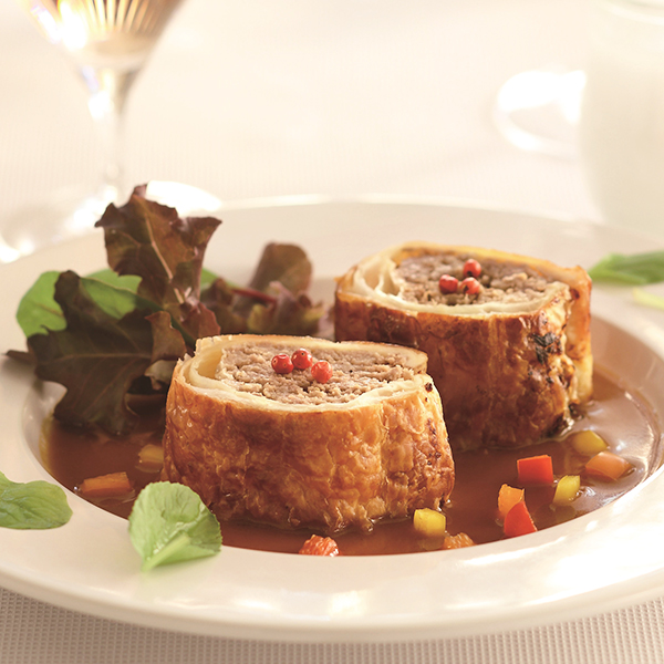 牛肉は国産黒毛和牛のみを使用し、パイ生地で包んでじっくり焼きあげ旨みをとじ込めたビーフパイです。パイ生地のサクサクした食感と、黒毛和牛と野菜の旨みを、マデラ酒の上品な甘みと香りのソースがひとつにまとめています。