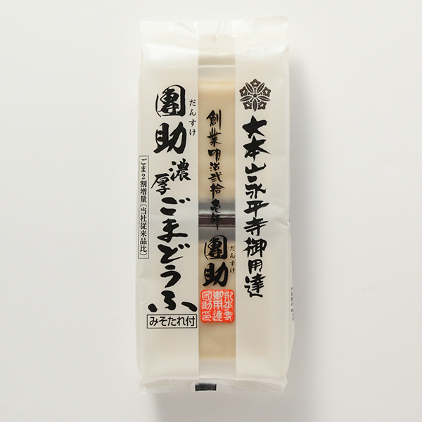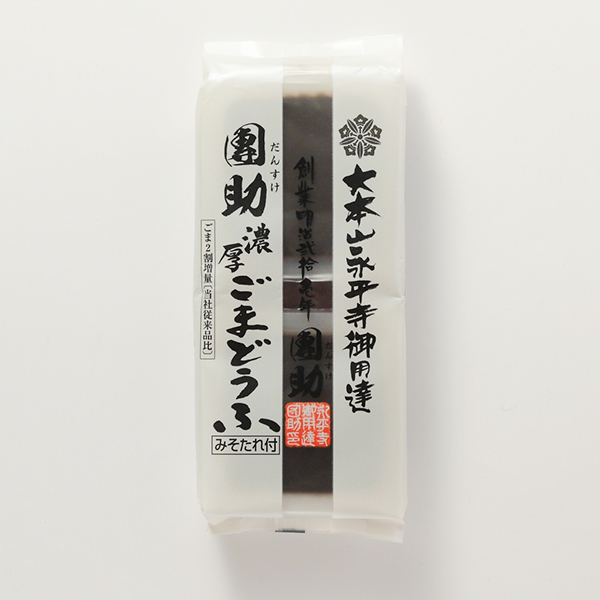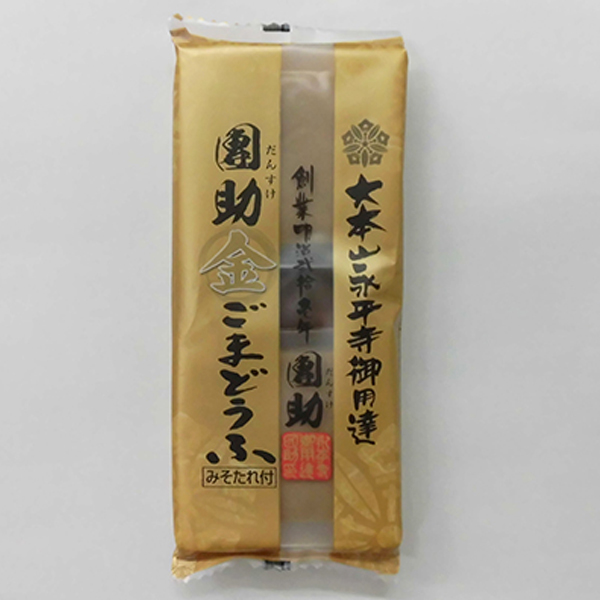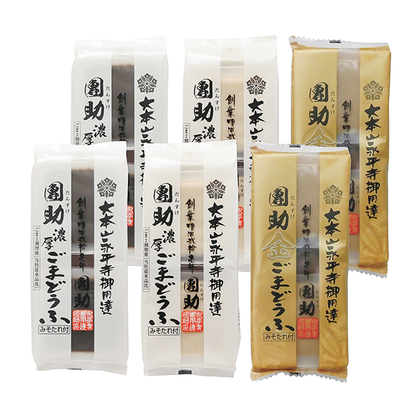 770年以上ある歴史と伝統を受け継いでいる禅の道場 曹洞宗大本山永平寺。精進料理の代表格として、永平寺に受け継がれてきた團助の胡麻豆腐は、良質のごまと葛粉を丹念に練って作られています。胡麻を2割増量(従来品比)し、より濃厚で香ばしい風味の濃厚白・黒ごまどうふに、希少価値の高い『金胡麻』を使用した香り豊かな濃厚金ごまどうふの三種の詰合せです。