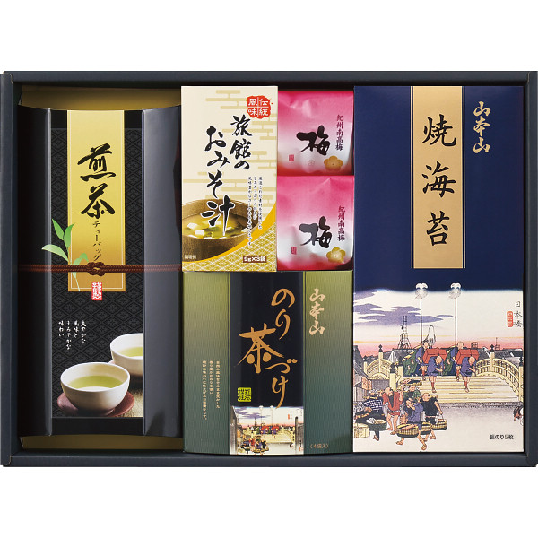 内容:山本山焼海苔(板のり5枚)、山本山のり茶づけ×4(1袋6.2g詰)、栗原園煎茶ティーバッグ3g×8、紀州梅干し1粒×2、旅館のおみそ汁(粉末)9g×3